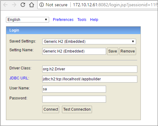 Run the runH2DB batch file from the [webapps/appbuilder/WEB-INF/package/h2/bin] folder to start the H2 Database and display the administrative console. Do not use the management console window. Close the open web browser window.