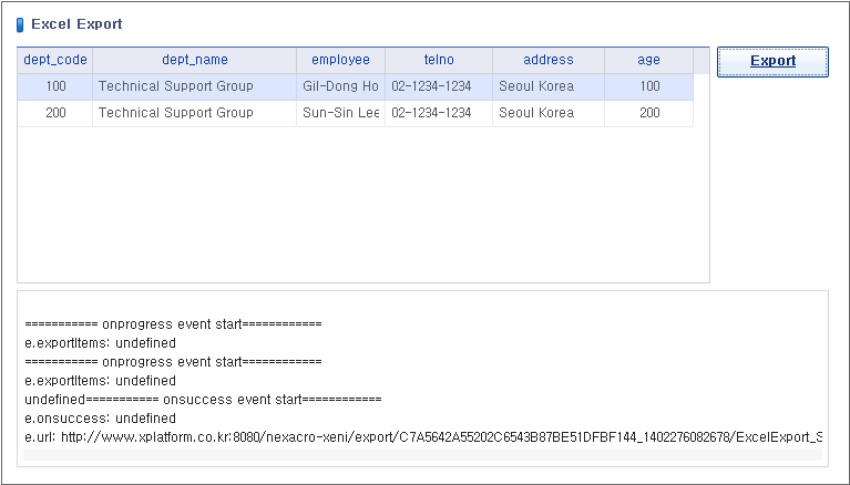If you click the export button in the sample figure below, then the contents of the grid are divided and transmitted to Nexacro-xeni.