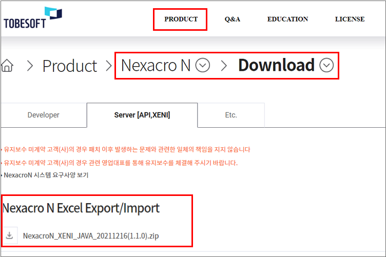 기술지원 사이트 메뉴 PRODUCT > Nexacro N> Download > Server [API, XENI]에서 war 파일이 포함된 압축 파일을 내려받을 수 있습니다.